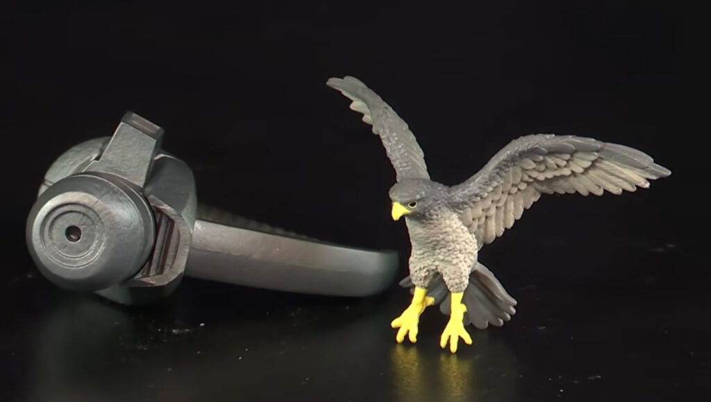 The gun seems like a dead ringer for Professor Hulk, hopefully he’s wearing his iconic bunny slippers. I’d assume the bird is some kind of falcon but I have bird blindness so your guess is as good as mine.